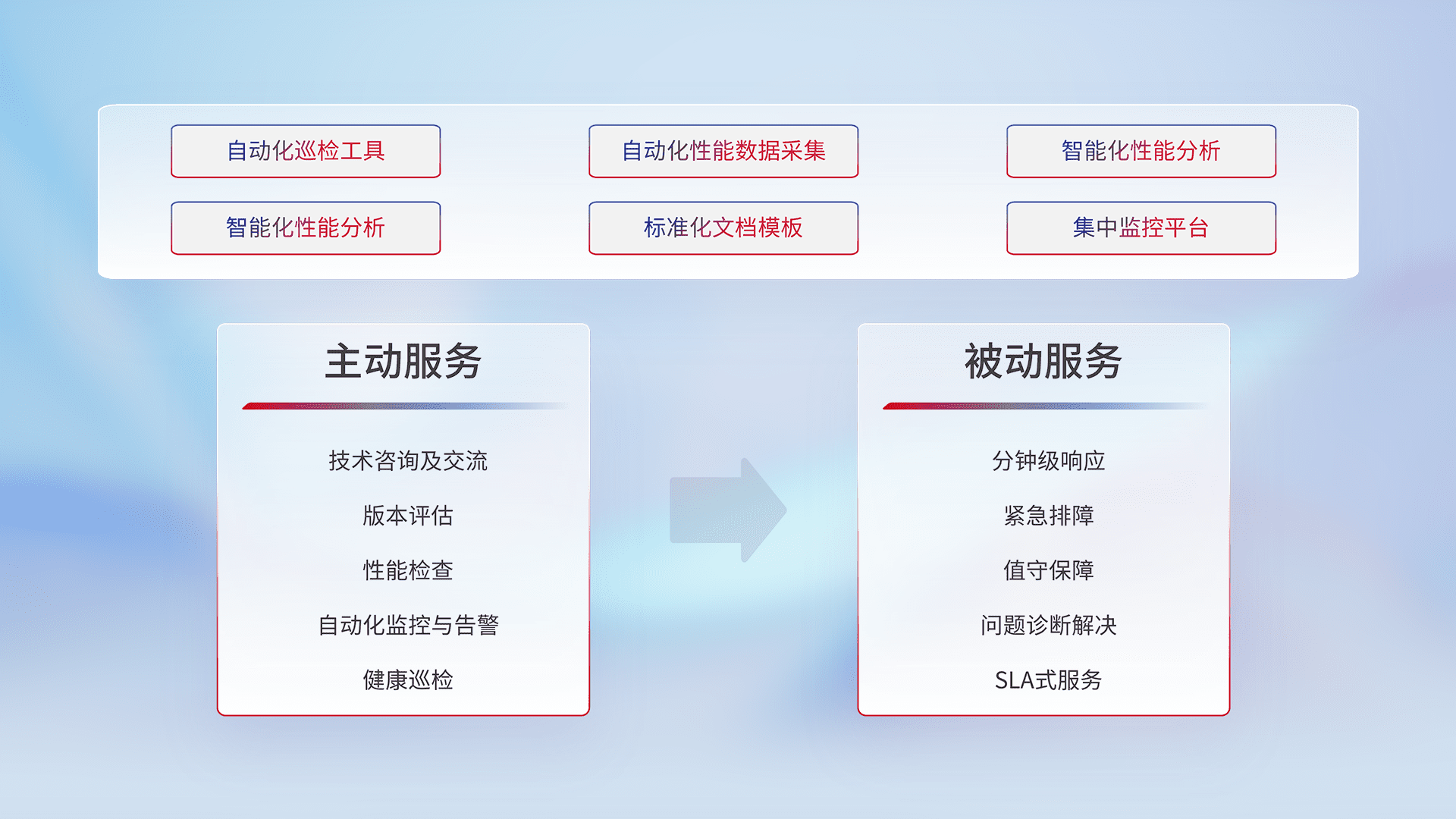 智能化工具和标准化文档,,保障服务质量,,提供主动服务(包含技术咨询、、、版本评估、、性能检查、、自动化监控与告警、、、、健康巡检)和被动服务包含(分钟级响应、、、、紧急排障、、值守保障、、、、问题诊断解决、、SLA服务)。。